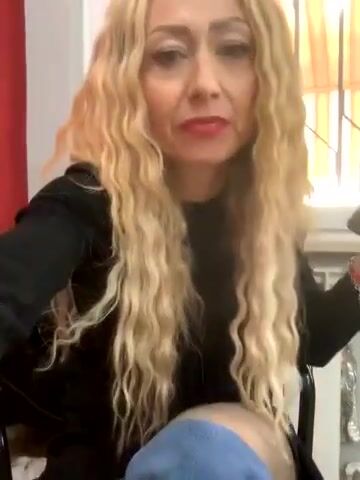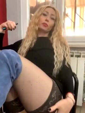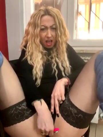 Milf bionda si masturba con dildo in autoreggenti