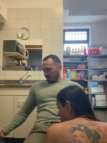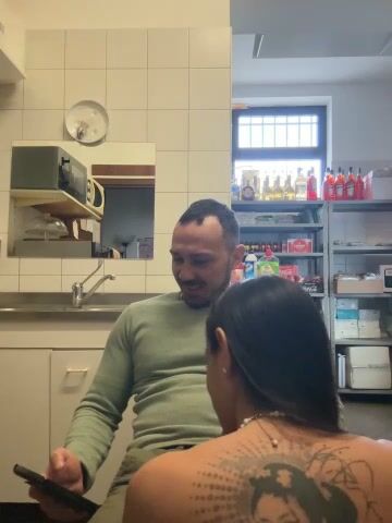 Moglie tettona succhia il cazzo a suo marito di dietro il bancone del bar