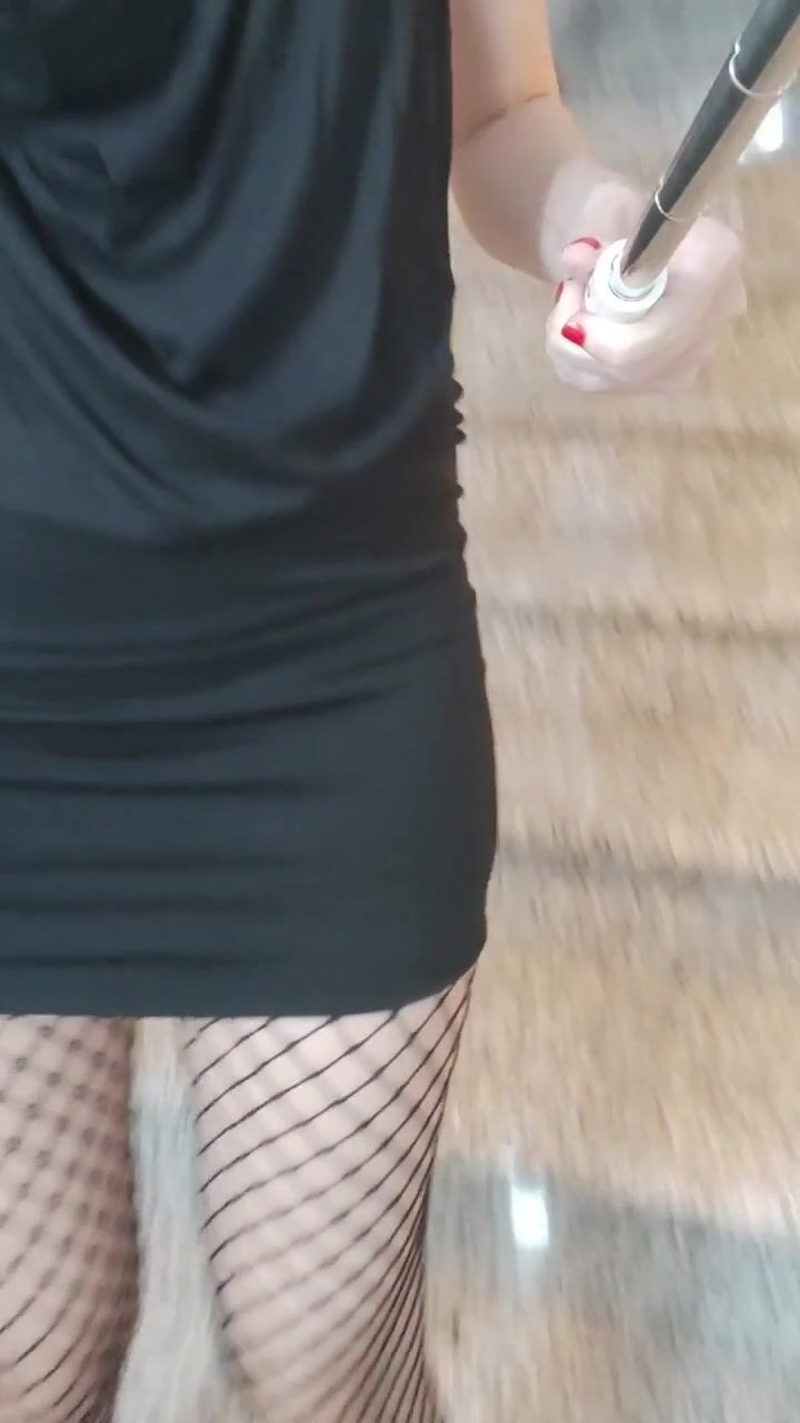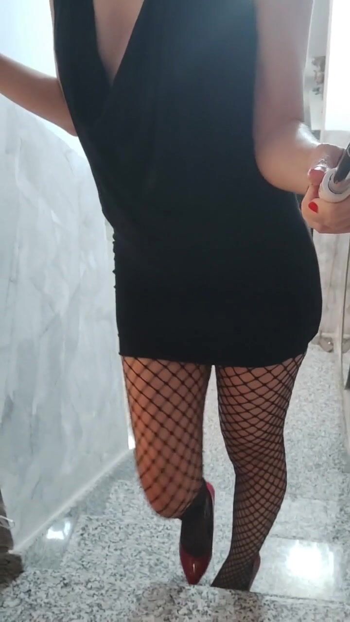 Senza slip in calze a rete e tacchi a spillo