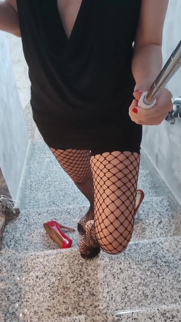 Milf italiana esibizionista sulle scale in tacchi e calze a rete senza mutandine